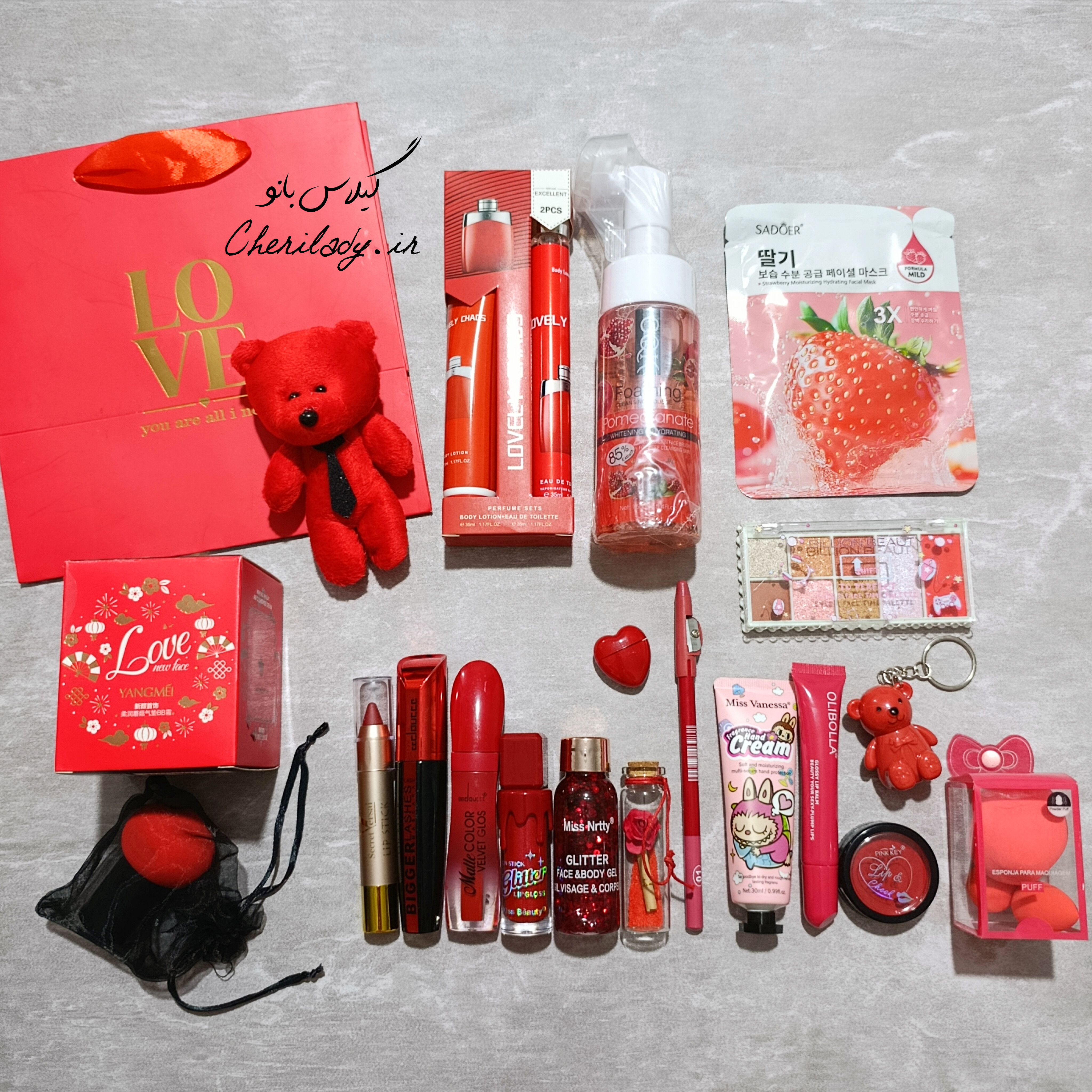 پک اقتصادی لوازم آرایشی قرمز خرسی ❤️🧸💄 مناسب هدیه ولنتاین / روز عشق / هدیه تولد / سالگرد ازدواج